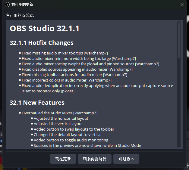 OBS32.1.1上线 修复了音频混音器的一些问题