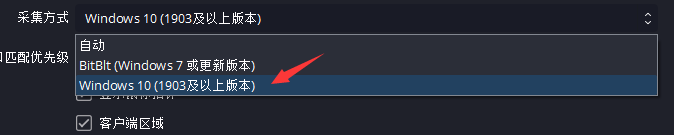 - 采集方式我们可以选择Windows 10,如果是自动或者BitBlt可能会出现无法正常捕获到程序画面的问题