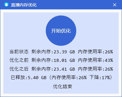 二话不说,直接点击“开始优化”按钮,软件就会立刻对内存进行清理,清理完成后,也会在窗口中显示清理前和清理后,剩余内存和内存使用率的具体数值,方便主播对比优化效果。