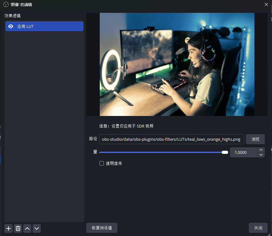 开始之前我们需要准备好自己需要的LUT文件,然后打开OBS,选择想要应用LUT的来源,并点击滤镜按钮,接着在效果滤镜中添加应用LUT,并在路径中选择提前准备好的LUT文件。此时在预览窗口中我们就可以看到加载LUT之后的效果了,调整好效果之后直接点击确定即可。