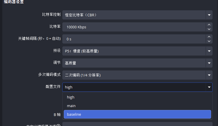解决办法也非常简单,打开OBS的设置窗口,选择输出,将输出模式更改为高级,在编码器设置中找到配置文件选项,通过下拉菜单将其设置为baseline,这样就可以确保编码流中不包含B帧了。也可以将最大B帧设置为0。