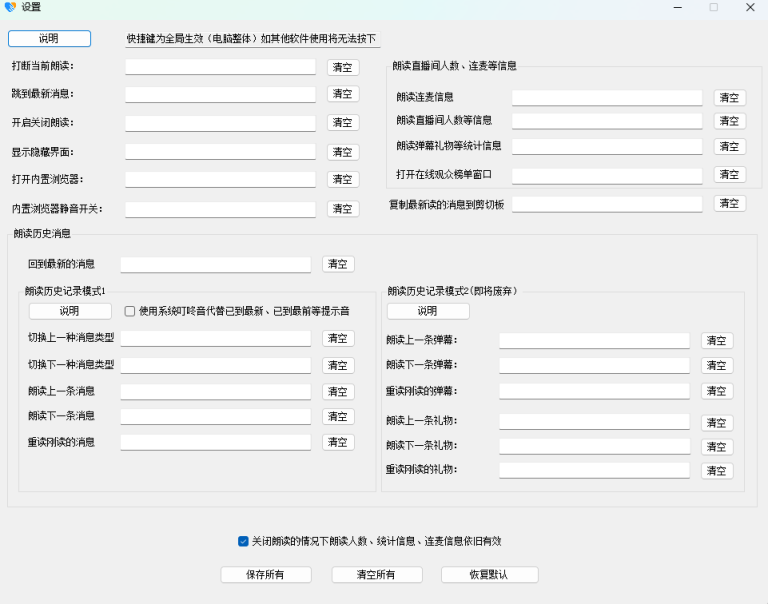 首当其冲的重大功能改进是在快捷键设置方面,新版本的弹幕助手无障碍版对于快捷键功能进行了重新制作,在新版本下,快捷键支持各种组合键搭配,且不再与其它任何软件冲突了,设置快捷键可以更加自由。为了方便用户们回到最新消息,回到最新消息的默认快捷键由此前的Ctrl+Shift+(Enter)回车,改为Ctrl+Shift+(Space)空格。此外,软件启动的时候默认使用管理员身份启动,增加了软件运行时的稳定性与兼容性。