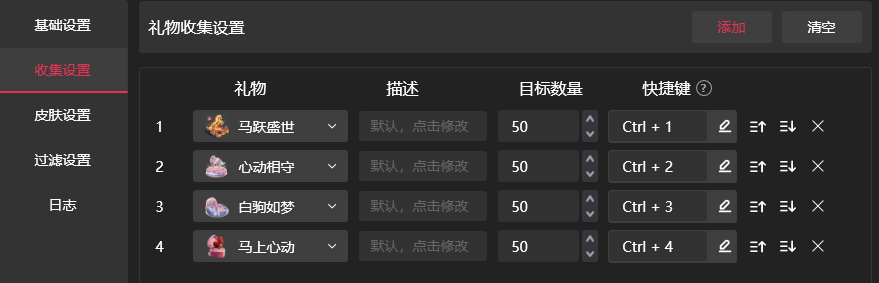 首先,在新版本当中新增了快捷键功能,通过快捷键可以快速对礼物收集器计数进行调整,每一个礼物都可以进行单独设置。