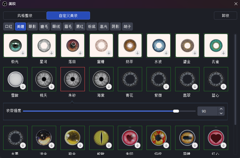 在新版本新增了美瞳效果。在美颜摄像头的面板中找到美妆的按钮,点击之后打开自定义美妆即可找到美瞳的分类了。在该版本中一共上线了26种不同类型的美瞳,它们颜色不同,样式各异,选择之后就可以立刻在预览画面中实时看到效果,并且还可以手动调整妆容的强度,找到最适合自己的显示效果。