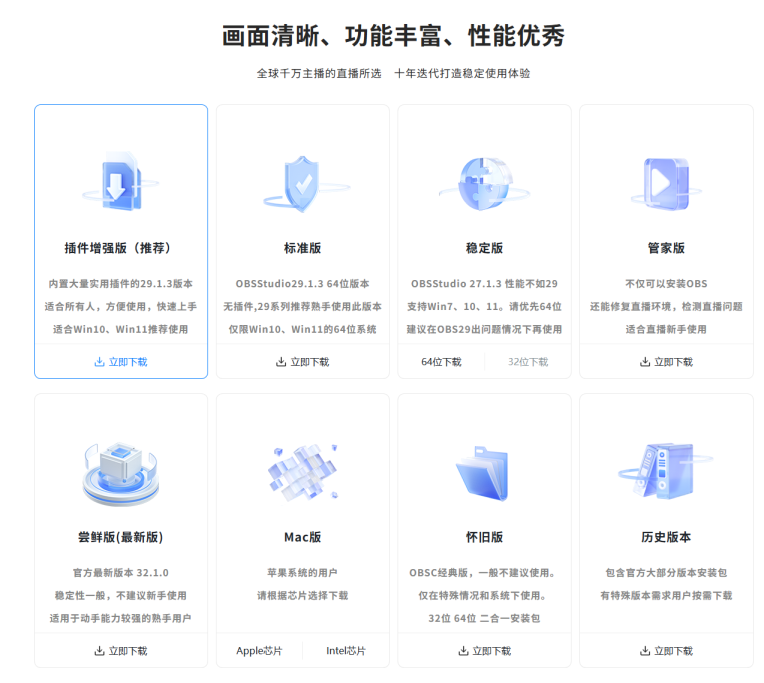 如果对于新的混音器设计不满意,更习惯旧版本的设计,也可以通过安装旧版本的方式重新回去使用旧版本。可以前往d.obs.cn体验高速下载官方免费安装包,包括最新版本和旧版本都能在里面找到。